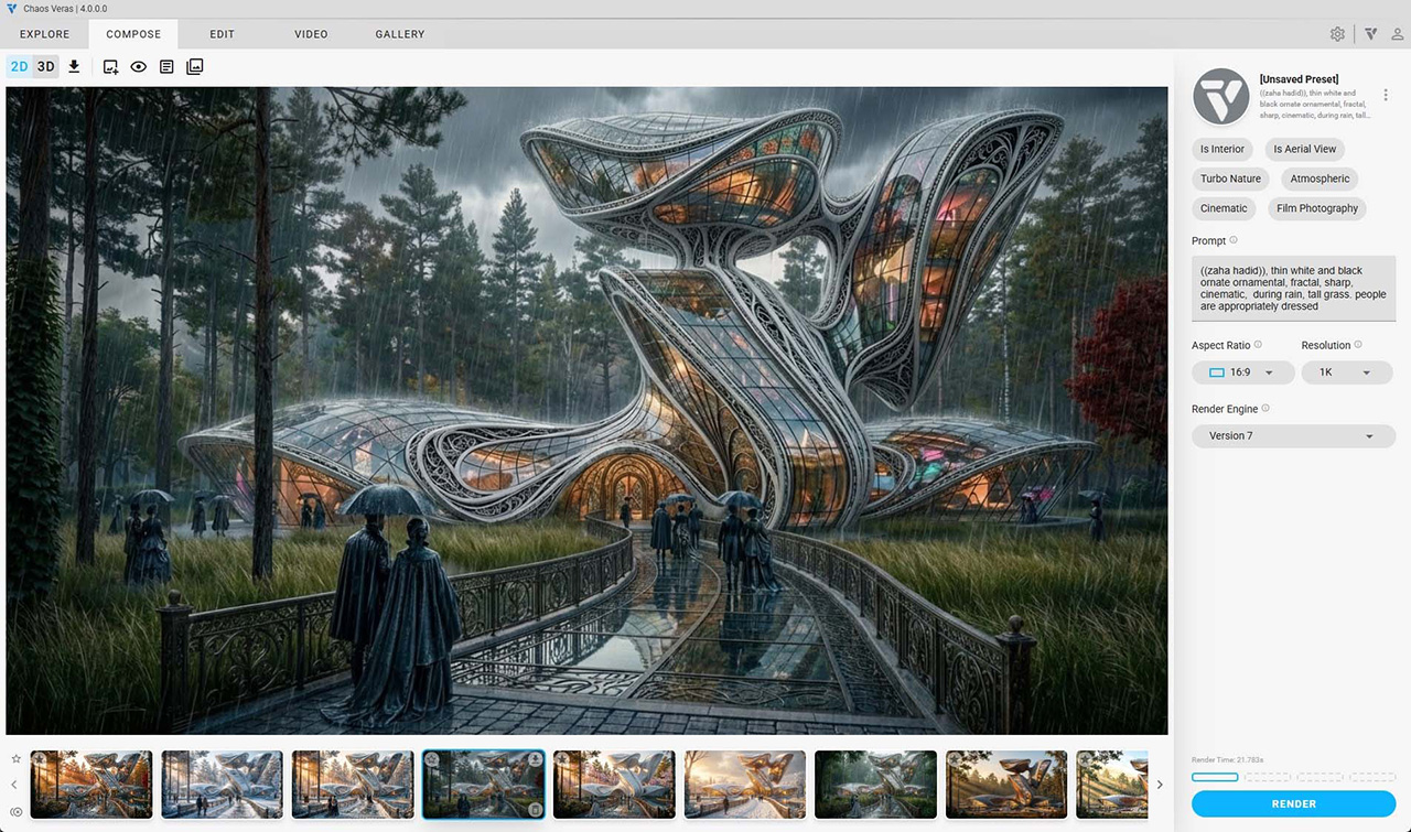 Veras 4.0 diffère des générateurs d'images par IA à usage général, car il est conçu pour le rendu architectural par IA dans les flux de travail de CAO et BIM. Il utilise vos modèles ou croquis existants et vous fournit rapidement plusieurs idées de conception, ce qui le rend idéal pour l'idéation et la génération rapide de concepts rendus par IA.