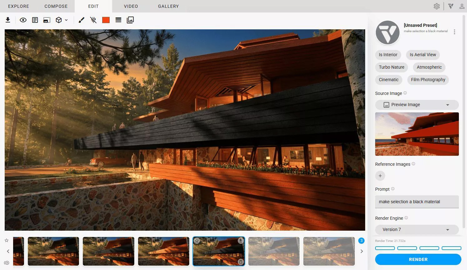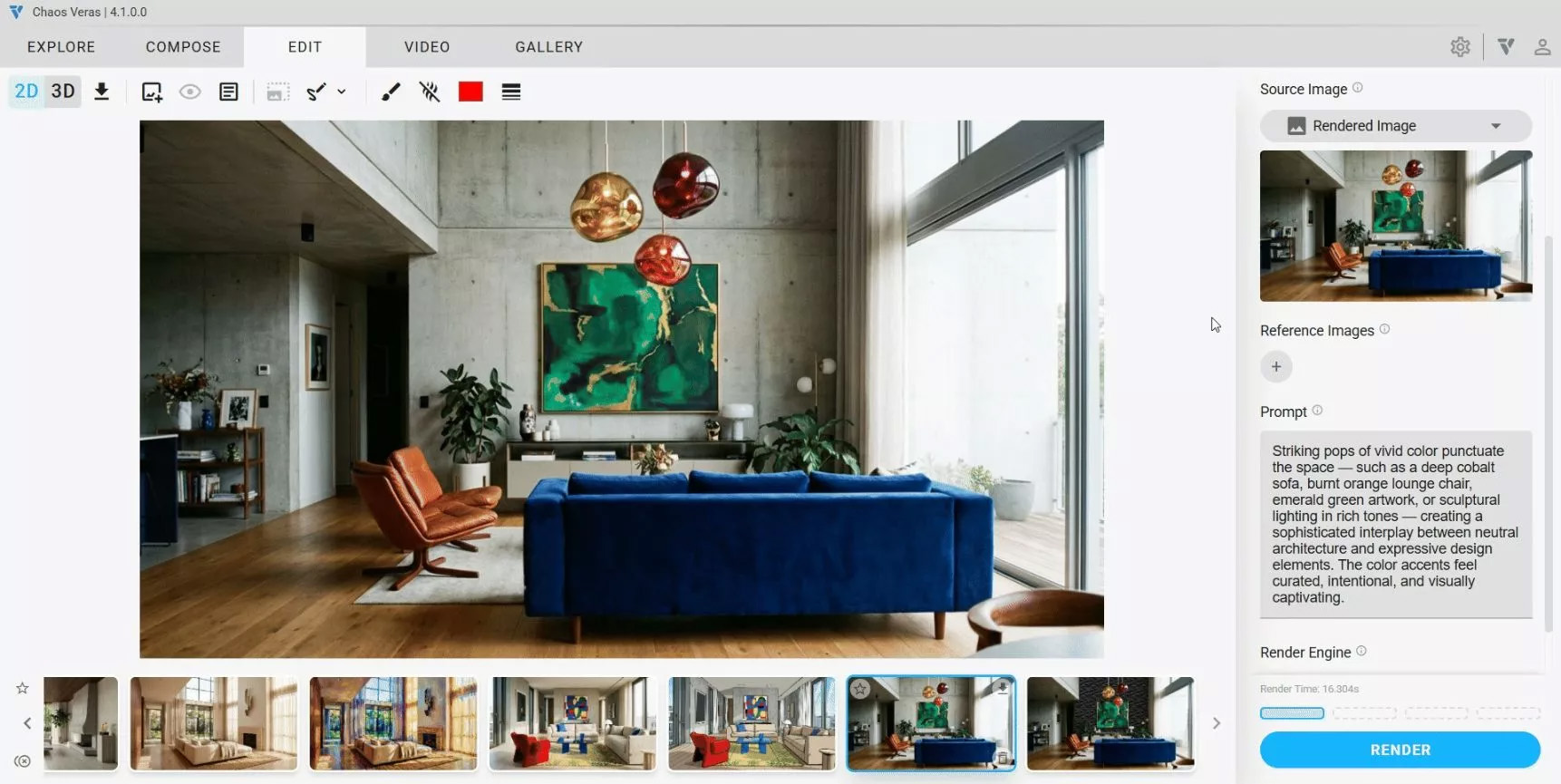 • Veras is een “one stop shop” die automatisch elke render bewaart met zijn volledige instellingen. Dankzij de galerij en de ingebouwde gereedschappen kan je al je vorige renders opnieuw bekijken en bewerken.
