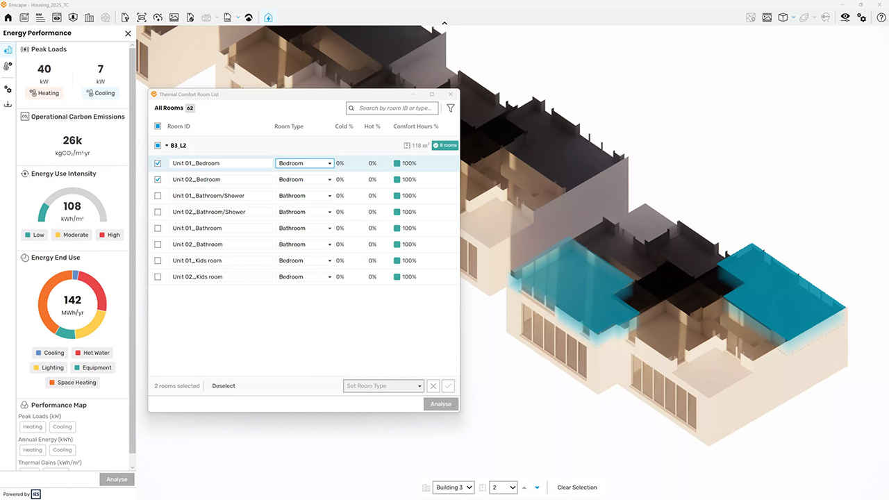 Une conception confortable est souvent plus efficace. En analysant le confort thermique, vous améliorez également votre aperçu des performances énergétiques, car Enscape Impact prend en compte l'occupation, les charges internes et les modes d'utilisation pour chaque type de pièce.