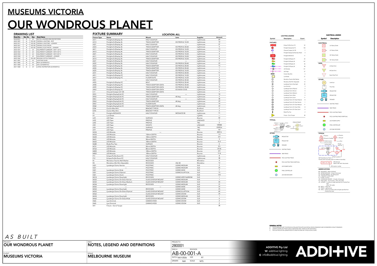 Shaw gebruikte Vectorworks Spotlight van bij de eerste plannen tot productie en oplevering. Hij maakte gedetailleerde 2D- en 3D-tekeningen, schema’s en rapporten voor honderden armaturen over de vier biotopen heen. In totaal omvat de tentoonstelling ongeveer 530 galerijarmaturen, 380 vitrinearmaturen, 240 meter LED pixel tape en een breed scala aan geïntegreerde, van achteren verlichte elementen. Additive werkte voor de armaturen met 11 kerntypes. Reken je ook alle verschillende bevestigingsmethoden, accessoires en toepassingen mee, dan kom je op 70 verschillende types.