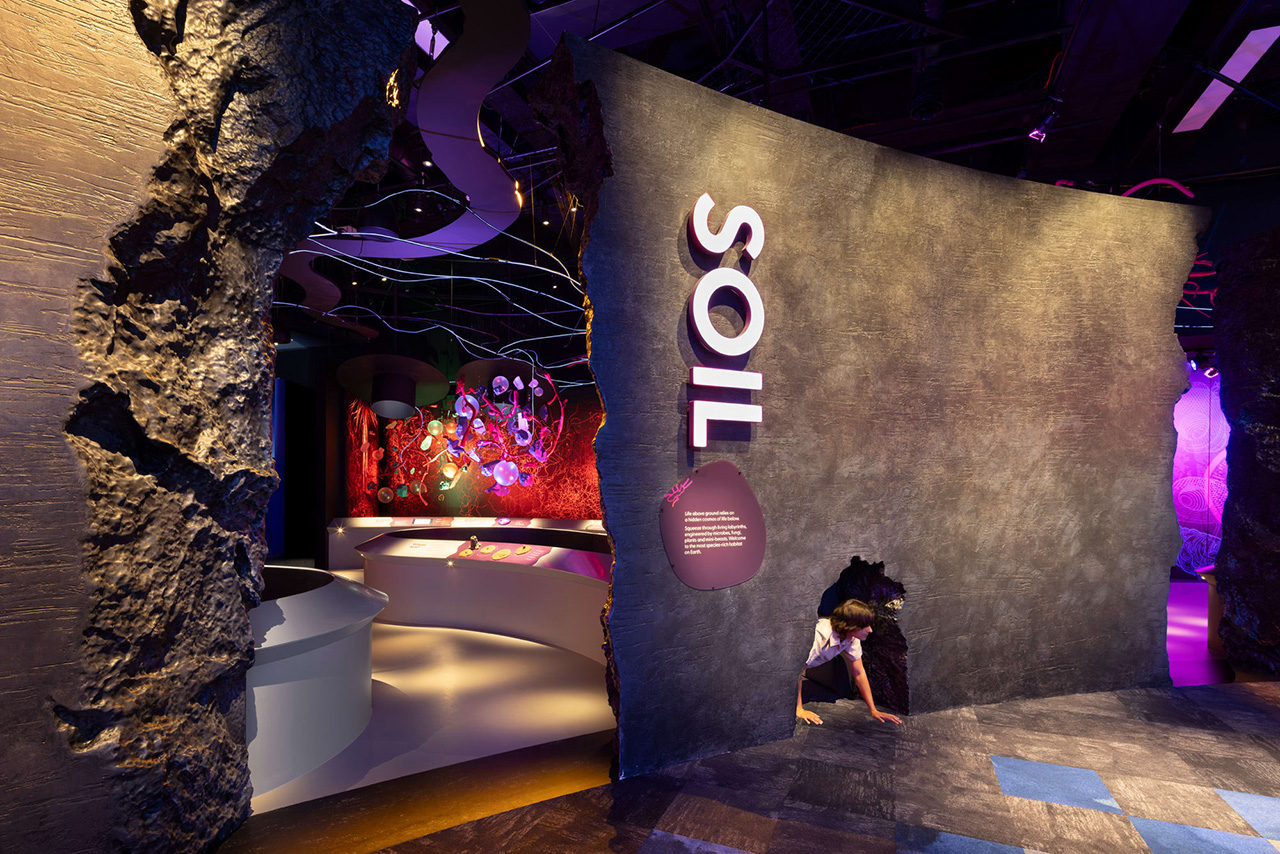 Het zwevende myceliumnetwerk in de bodembiotoop was een van de meest complexe elementen in de tentoonstelling. De inspiratie hiervoor kwam van wortelsystemen van paddenstoelen en ondergrondse communicatienetwerken. Het idee evolueerde van eenvoudige schetsen naar een volledige lichtinstallatie gemaakt van LED-tape.