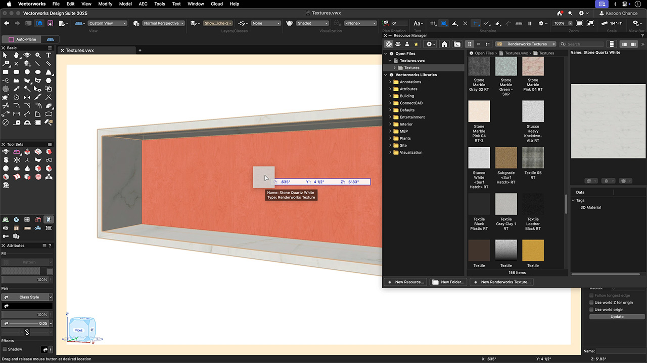 Możesz użyć narzędzia Tekstura w trybie „Zastosuj do powierzchni” lub po prostu przeciągnąć i upuścić teksturę za pomocą klawisza skrótu, aby nałożyć ją na dowolną powierzchnię bryły 3D. Ta metoda sprawdzi się w przypadku niestandardowej stolarki, ścian akcentowych i mebli, które wymagają kilku typów wykończenia.