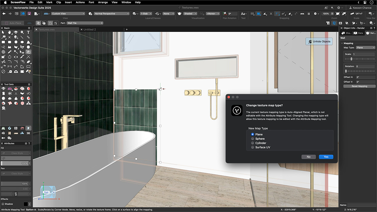Ta metoda nie służy tylko do poprawiania rozciągniętych lub źle wyrównanych tekstur na niestandardowych obiektach. Jeśli później zmodyfikujesz swój projekt, na przykład zmieniając rozmiar wbudowanej szafy, z łatwością dostosujesz wyrównanie tekstur, aby usłojenie lub kierunek wzoru materiału pozostały spójne. Narzędzie działa nawet na obiektach 2D, które jako wypełnienia używają obrazu, pozwalając Ci zadać o dopracowany, profesjonalny wygląd renderów i rysunków technicznych.