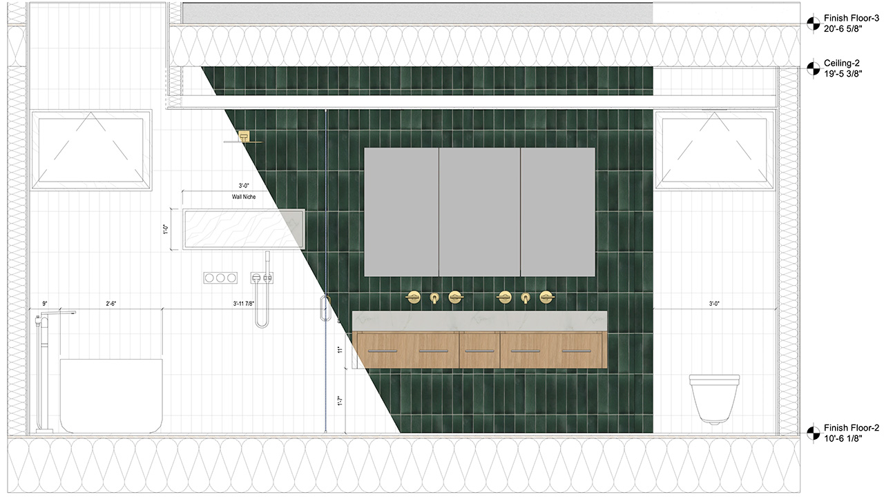 To zapewni odpowiednie powiązania: rzuty i rozwinięcia ścian wewnętrznych z nałożonymi kreskowaniami będą odpowiadać materiałom zastosowanym w renderach. Aby proces realizacji projektowanego obiektu przebiegał płynniej, spróbuj stworzyć lub wybrać charakterystyczne kreskowania dla każdego wykończenia. Pomoże to zarówno wykonawcom, jak i klientom szybko zrozumieć Twoją koncepcję.
