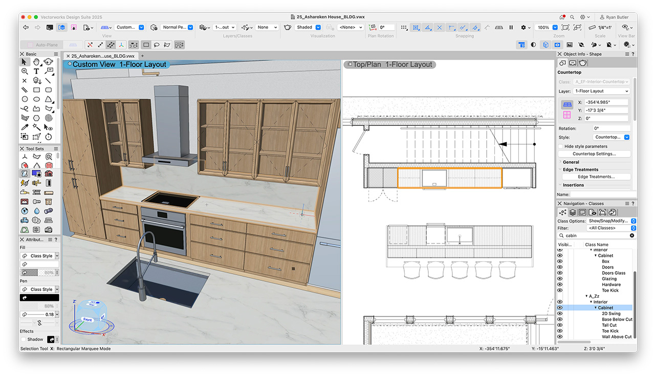 Dzięki ujednoliconemu środowisku projektowemu Vectorworks Architect pozwala Ci pracować jednocześnie w 2D i 3D, bez konieczności przełączania się między różnymi aplikacjami. Niezależnie od tego, czy tworzysz wstępne szkice, modelujesz złożone formy, czy przygotowujesz dokumentację wykonawczą – wszystko odbywa się w jednej, spójnej przestrzeni.